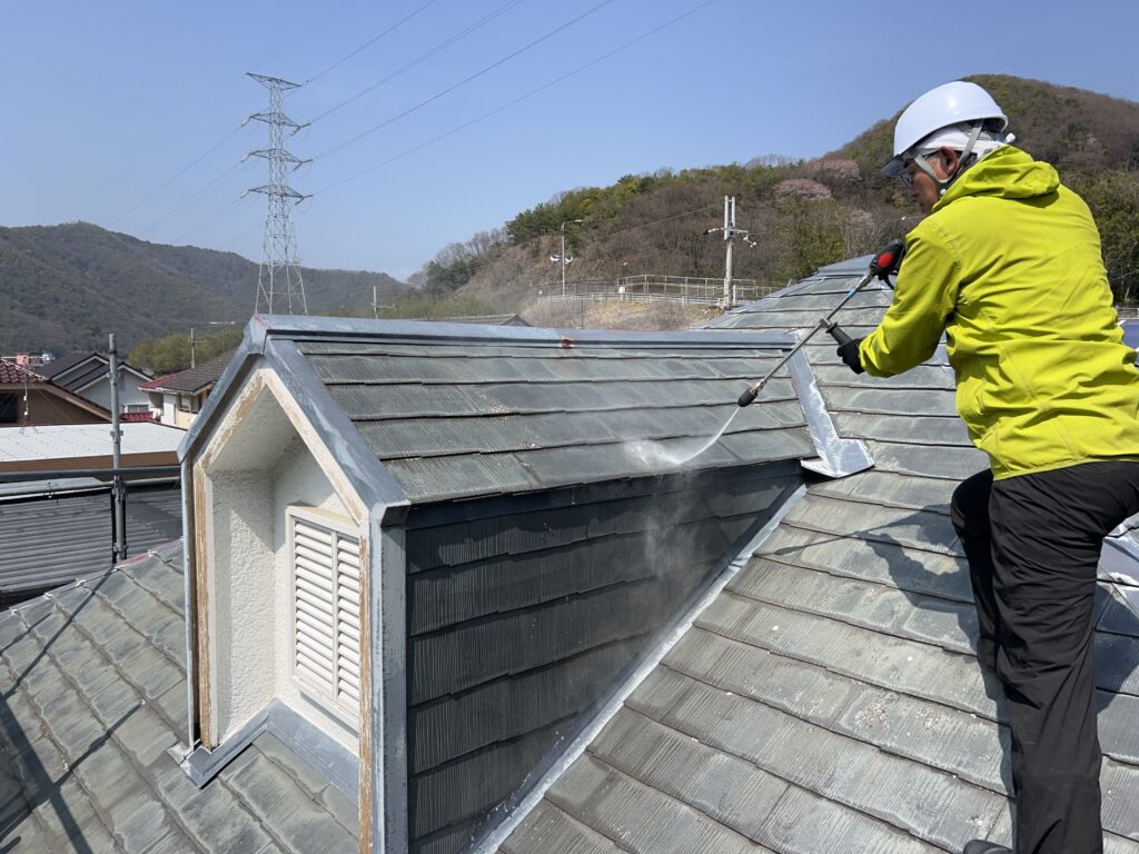 とはいえ、ただ強い水圧で洗えばいいわけではありません。特にサッシまわりなどは水が入りやすいため、場所によってしっかり水圧を調整しながら、丁寧に洗浄作業を行っています。