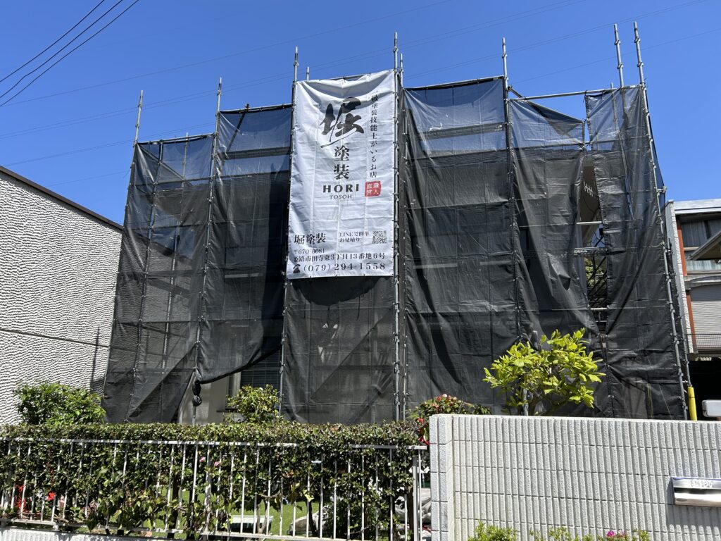 本日より姫路市にて、外壁と屋根の塗装がスタートしました。現場には当社のイメージシートを設置しておりますので、見かけられ際には現場見学も可能です。お気軽にお声がけくださいね!